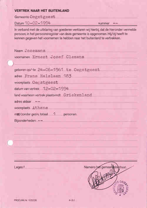 • Emigratie: vanuit Nederland naar Griekenland, 12 Feb 1994, Glyfada. Vanwege zijn werk verhuisde Ernst in februari 1994 naar Griekenland. Eerst bivakkeerde hij in wat hotels, maar na een paar maanden vond hj een huur appartement aan de Odos Nezer 5 te Glyfada, een voorstadje van Athene. Ernst trouwde met "Jose" Josephine Maria Ravenstein op 21 Mrt 1988 in Haastrecht, , Zuid-Holland, NLD. ("Jose" Josephine Maria Ravenstein werd geboren op 26 Apr 1961.) Ernst trouwde vervolgens met Arianne Maandag, dochter van Jacob "Jaap" Maandag en Sietske Bonte, op 17 Jul 1996 in Oegstgeest, , Zuid-Holland, NLD. (Arianne Maandag werd geboren op 23 Apr 1970 in Oegstgeest, , Zuid-Holland, NLD en werd gedoopt op 7 Jun 1970 in Oegstgeest, , Zuid-Holland, NLD.) |